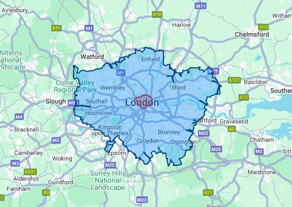 Se extiende por City of London y 32 distritos, siendo el límite la autopista orbital M25, pero sin incluir esta.