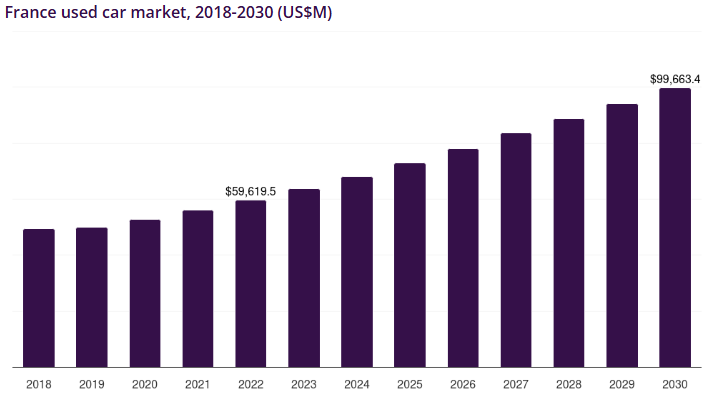 Actuellement, le marché européen des voitures d'occasion est évalué à 59,12 milliards de dollars et devrait atteindre 73,32 milliards de dollars en 2030, ce qui représente un taux de croissance annuel de 4,42 %.